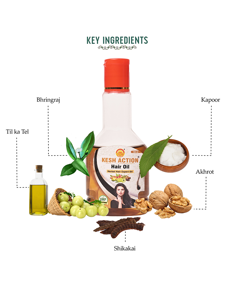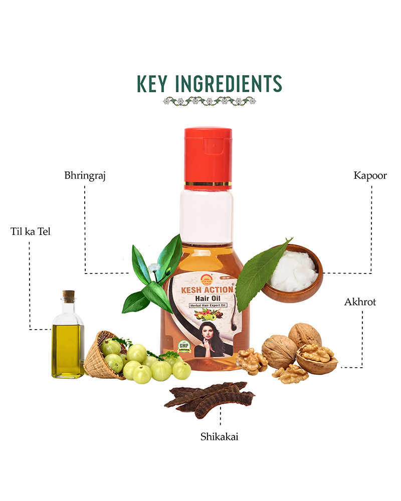 Discover the natural solution to achieve luscious and healthy hair with Kesh Action Hair Oil. Enriched with a blend of all-natural ingredients like Akhrot, Brahmi, Shikakai, Harad, Anvla, Tulsi, Kapoor, Til Ka Tel, Bhringraj, and more. This hair oil offers a holistic approach to addressing common hair concerns. Say goodbye to hair loss, dandruff, dryness, split ends, thinning, and greying. Enjoy the benefits of hydrated, revitalized hair while experiencing a sense of relaxation and rejuvenation. Embrace the power of nature with Kesh Action Hair Oil and unlock the secrets to beautiful, nourished hair.